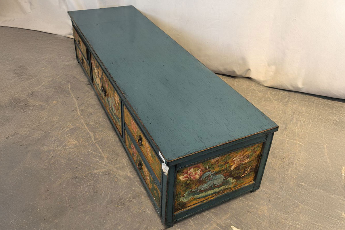 Mobile tibetano basso in legno dipinto, con quattro cassetti e due ante centrali. Le decorazioni floreali e le figure tradizionali su fondo giallo creano un vivace contrasto con la struttura blu petrolio.