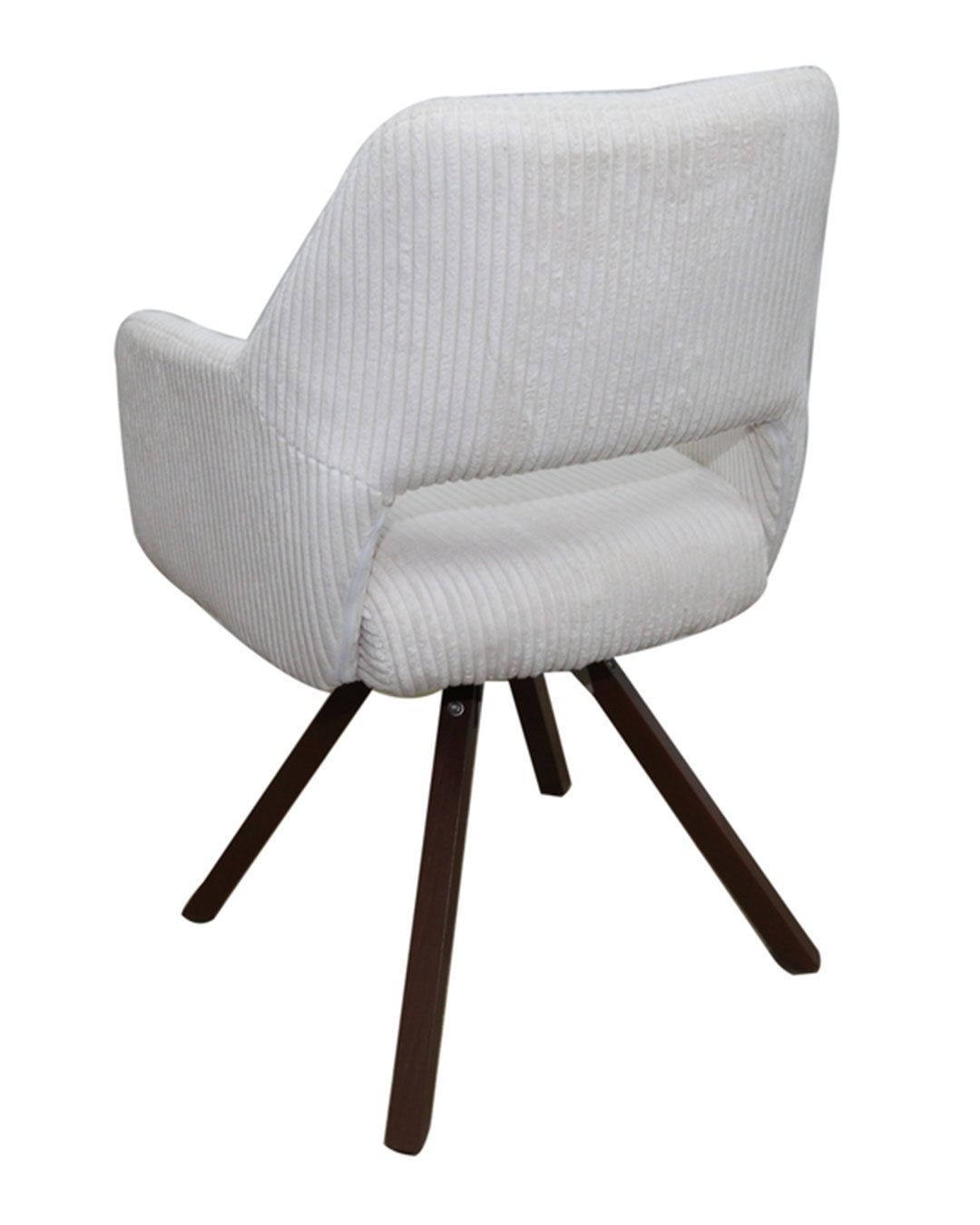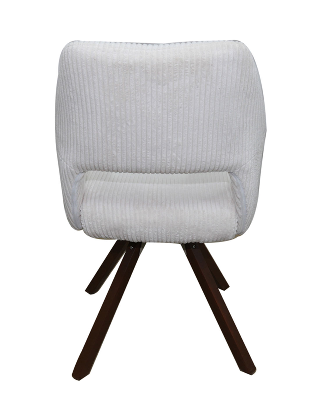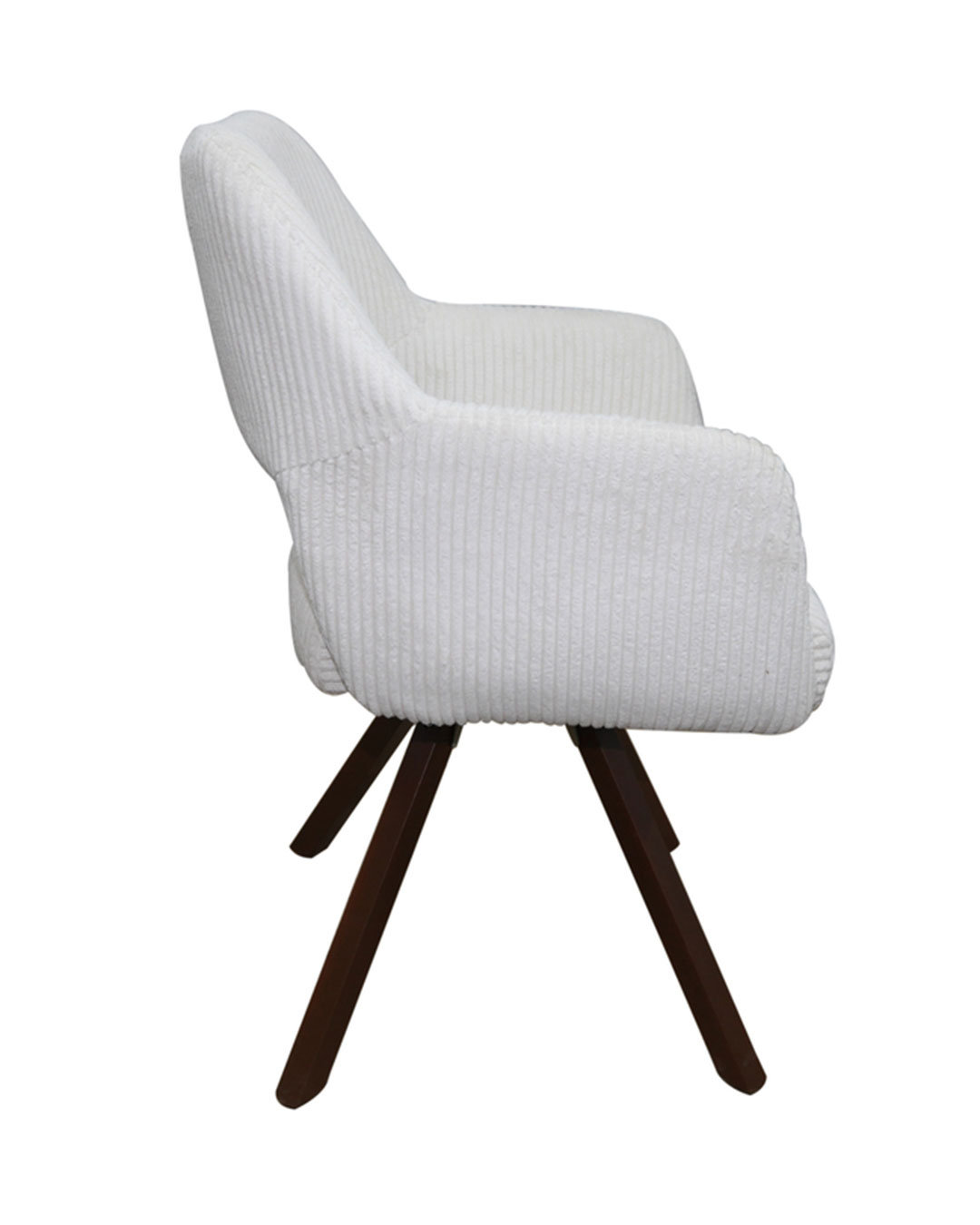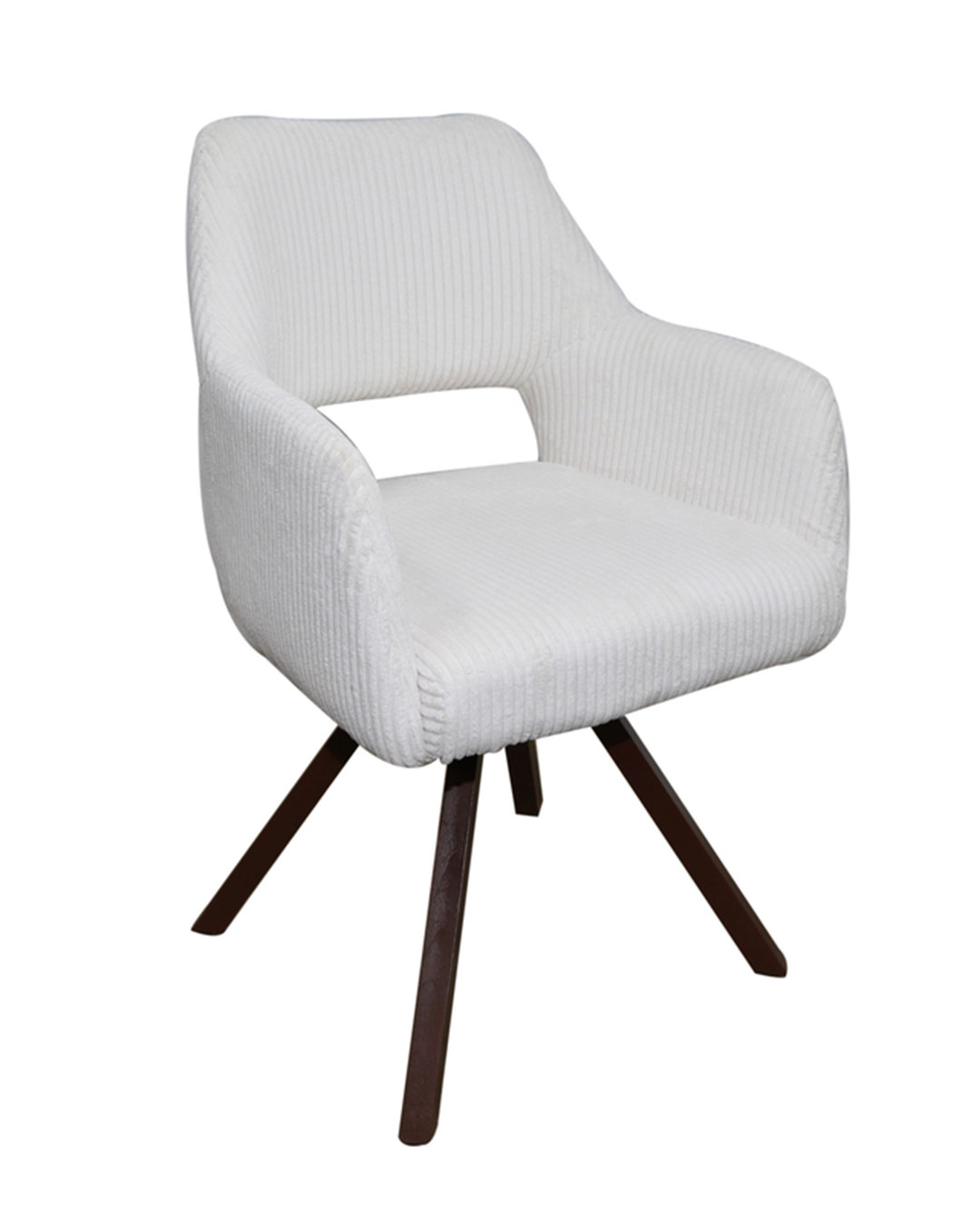 Linee accoglienti e proporzioni generose definiscono la sedia Fly a coste. Il tessuto a coste verticali aggiunge ritmo e matericità, rendendo ogni seduta un gesto di comfort. L’apertura tra schienale e seduta alleggerisce visivamente la forma, mentre la base a quattro gambe in legno dona solidità e calore.