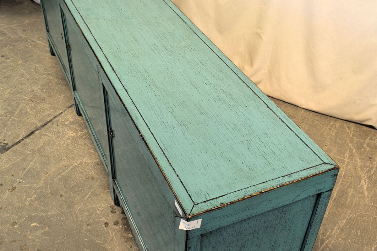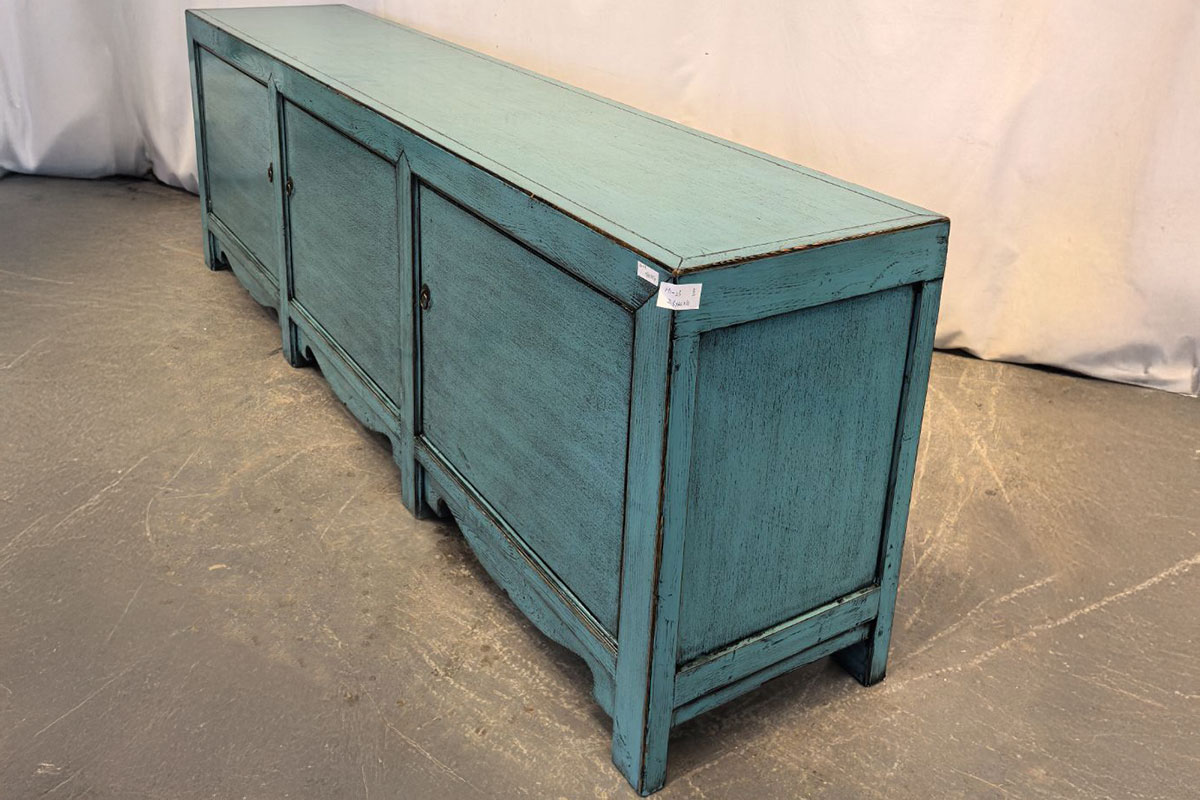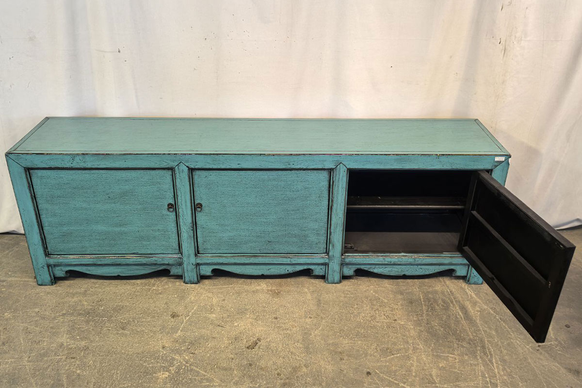Mobile tibetano in legno massello con tre ante frontali e finitura azzurro anticata, realizzata a mano. Le cornici incassate e la base sagomata donano leggerezza e ritmo alla struttura, mentre l’interno è dotato di ripiani ampi e funzionali.