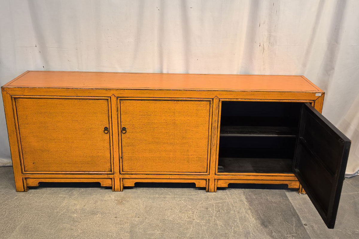 Mobile tibetano a tre ante in legno massello, proposto in una luminosa finitura arancio con patina anticata. La tinta calda valorizza la semplicità delle linee e dona carattere anche agli ambienti più minimal.