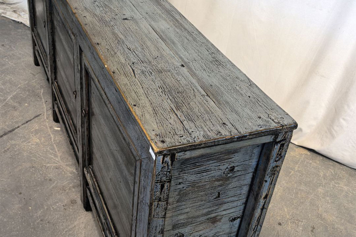 Mobile tibetano in legno massello con finitura azzurro-grigia dall’effetto anticato.