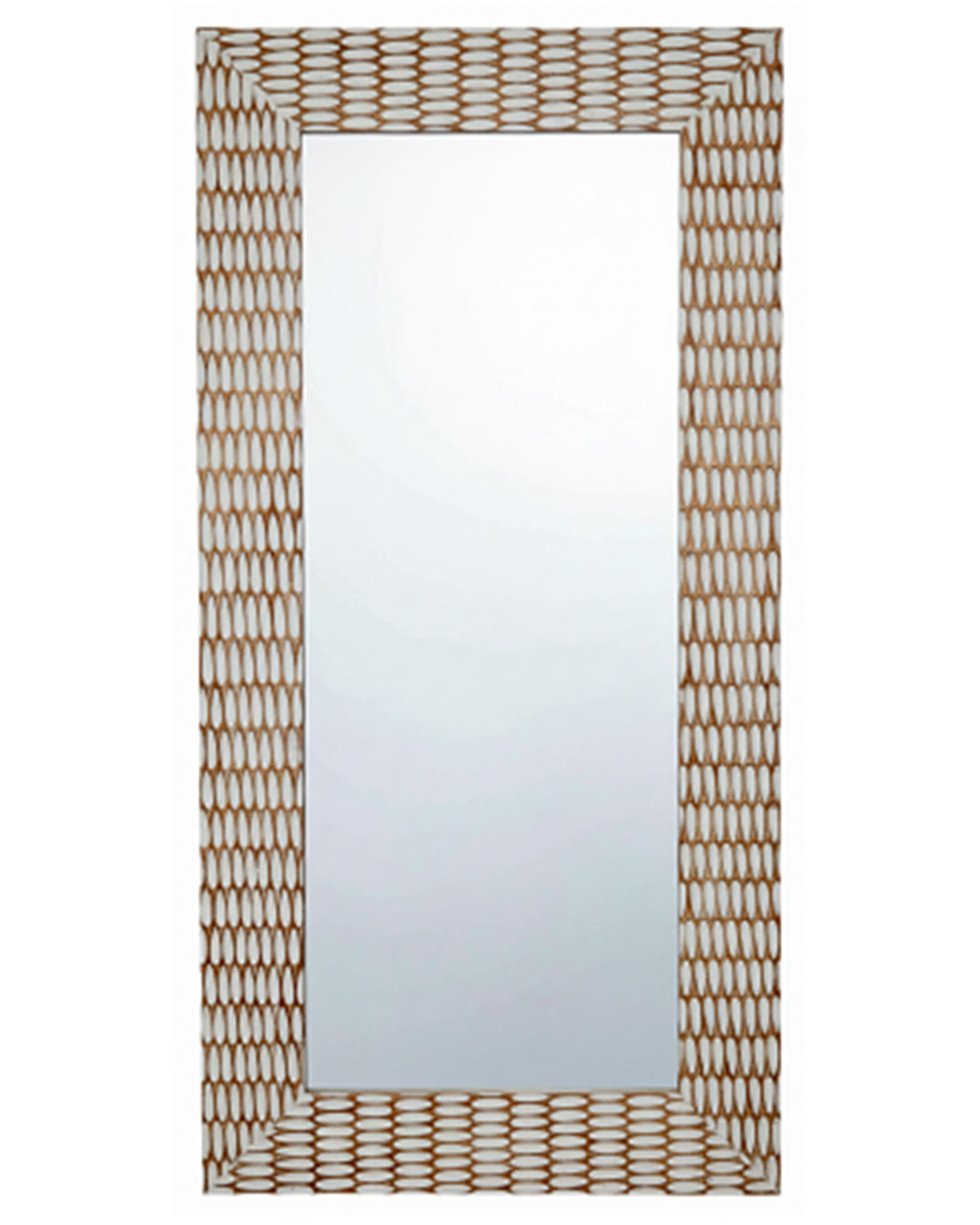 La cornice, caratterizzata da un motivo geometrico ritmato e leggero, crea un elegante gioco visivo che dona dinamismo alla superficie.