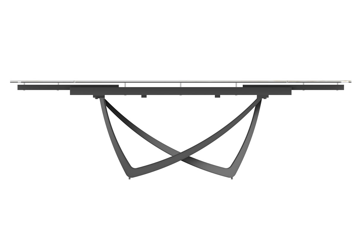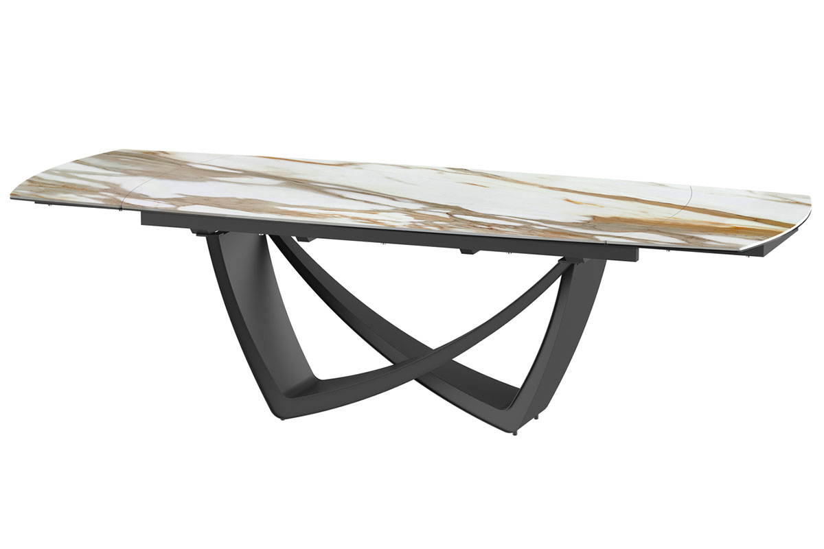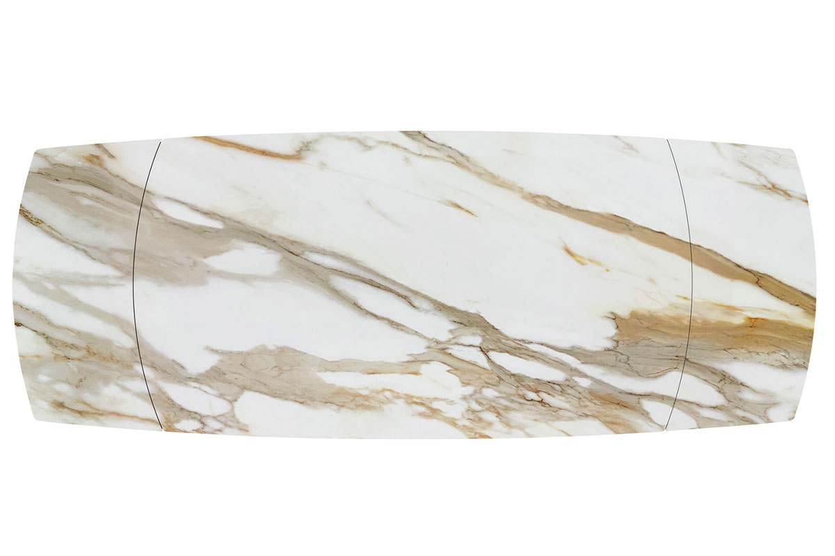 Tavolo allungabile dal design iconico, con piano in ceramica effetto marmo e base scultorea incrociata in metallo verniciato. Le venature naturali e i profili morbidi esaltano l’eleganza contemporanea, mentre il sistema di apertura integrato garantisce massima funzionalità e versatilità.